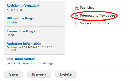 2- In edit page, scroll down to the section named “Publishing options” and enable or disable the “Promoted to front page” option.
