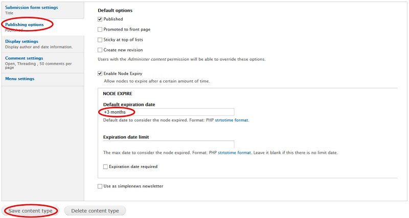 Scroll down to the section named “Publishing options” and edit "Default expiration date" option