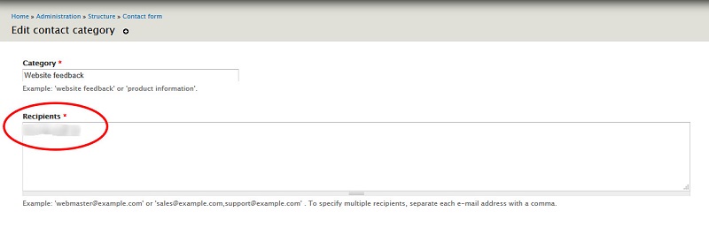 - Edit the e-mail address of Recipients the contact form: Browse to http://example.com/admin/structure/contact/edit/1: