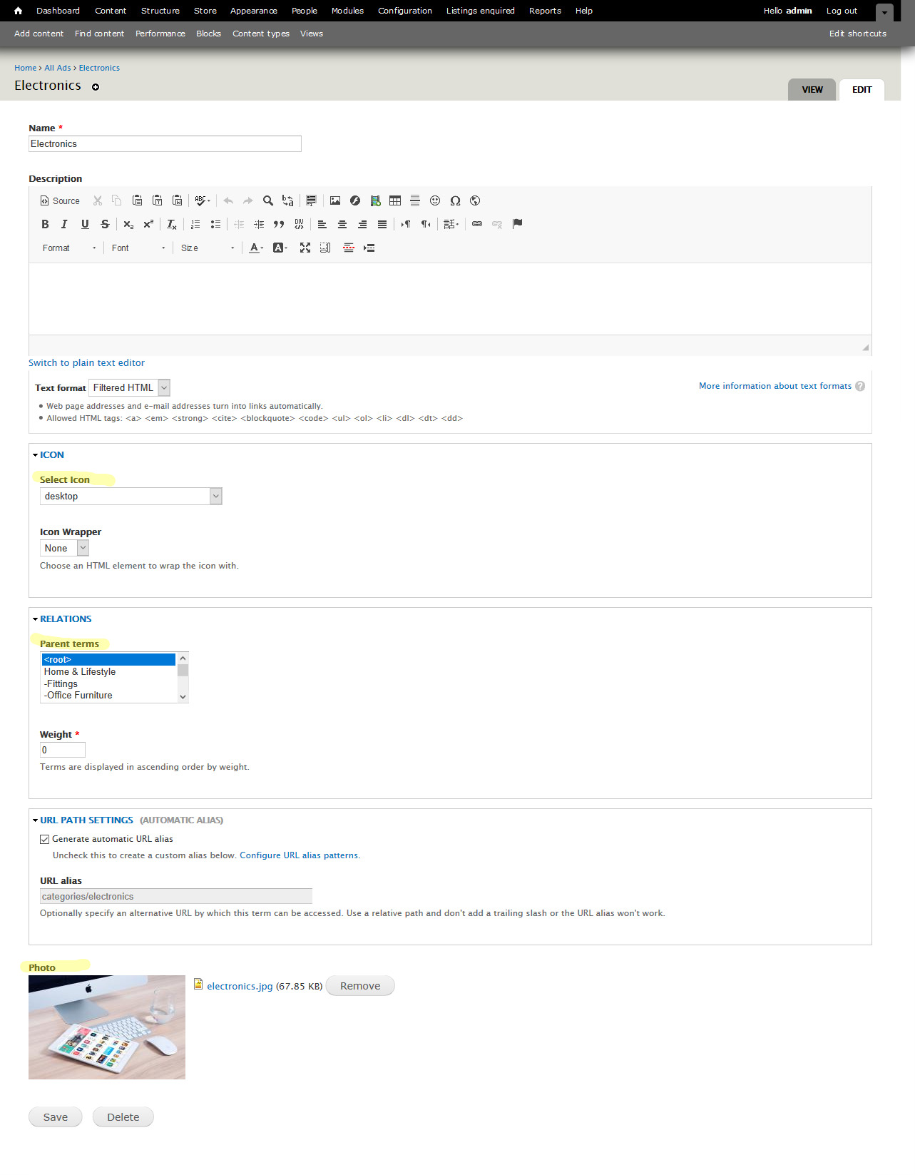 2. When you add a new parent term of Ad category as we explained in the "Managing Content” you must not forget to add a map marker for this new category, so select “Settings”: