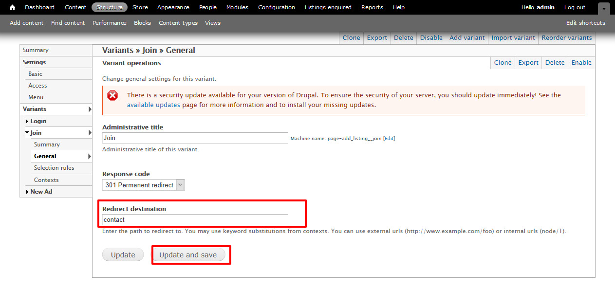 - In Redirect destination field, enter the path to redirect to, for example "contact" to redirect to Contact page. Then click on Update and save button.