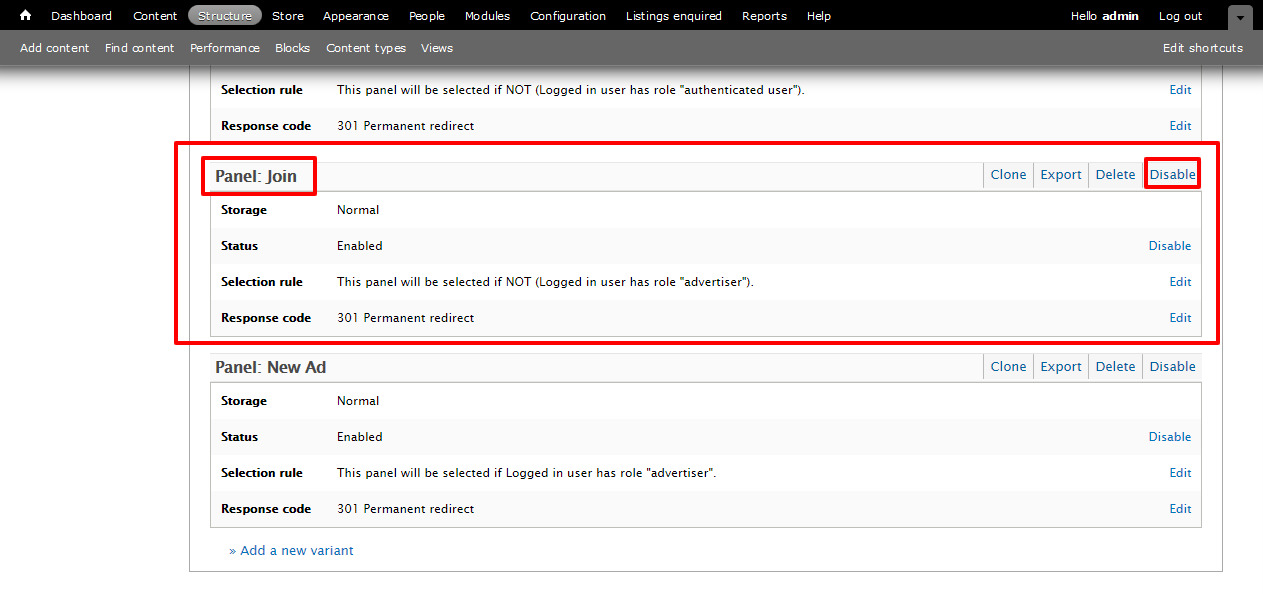 - Browse to http://example.com/admin/structure/pages/nojs/operation/page-add_listing/handlers/page-add_listing__join/settings