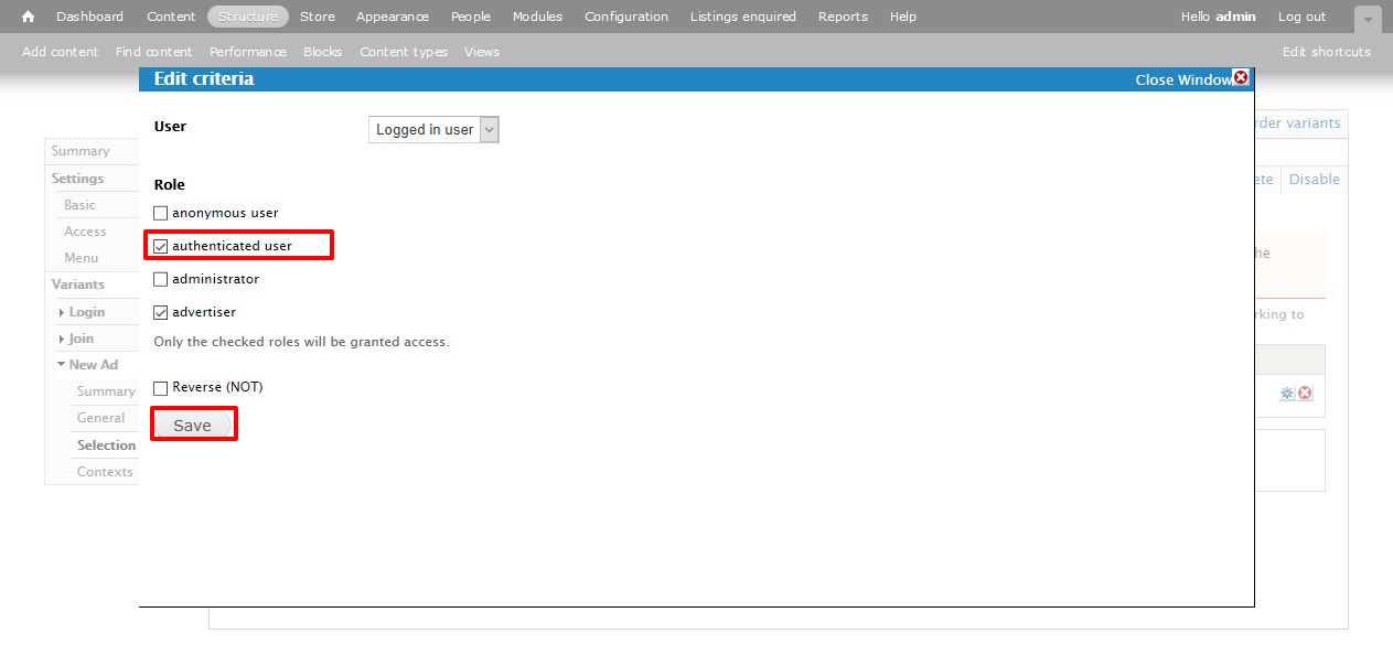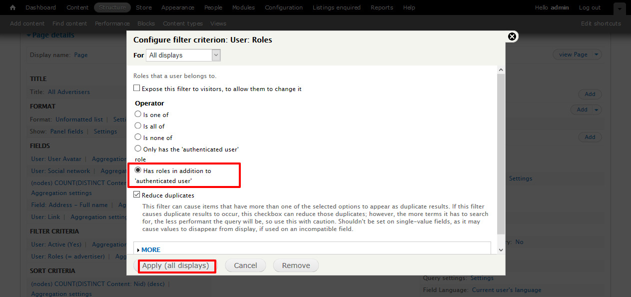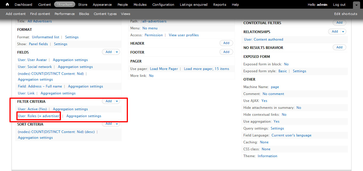 - Scroll down to Filter criteria section, click on User: Roles (= advertiser)