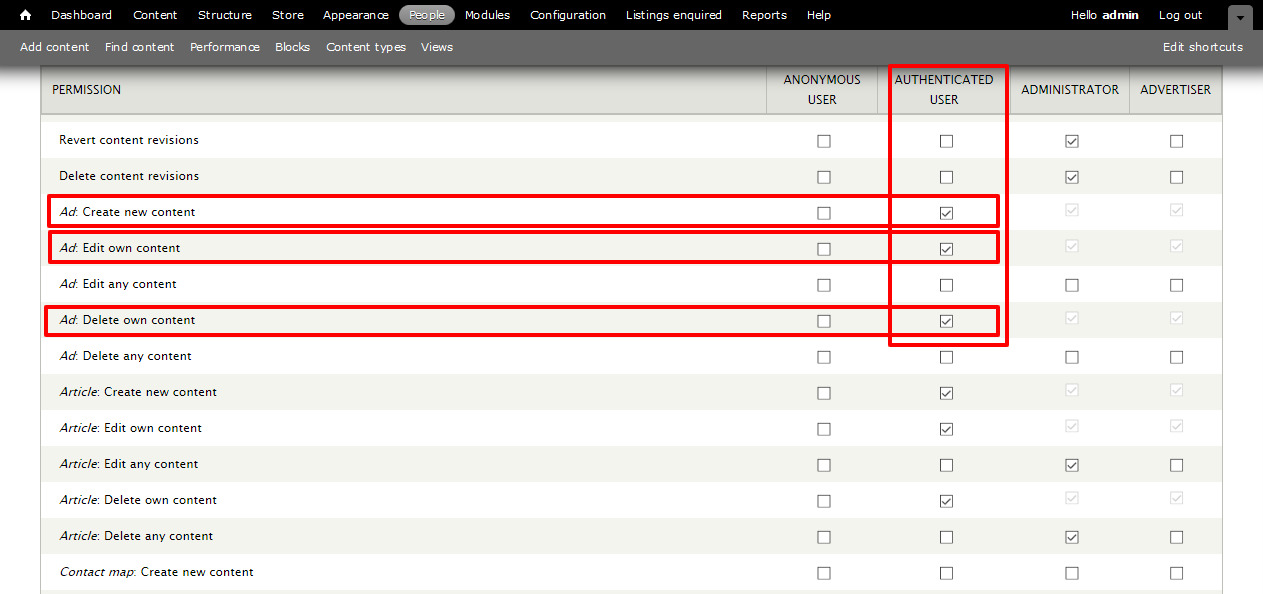 So you must assign each an authenticated user the "advertiser" role manually from: