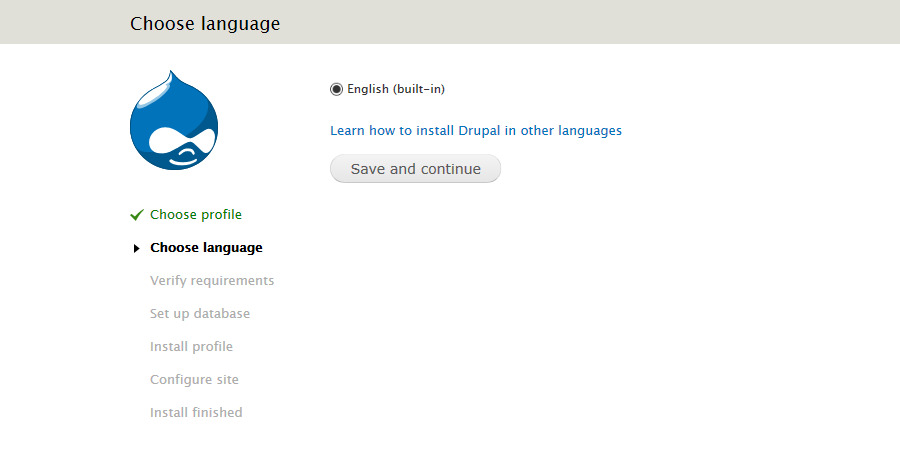 4. Select your language on the "Choose language" page and then click "Save and Continue" by default, the theme is English based.