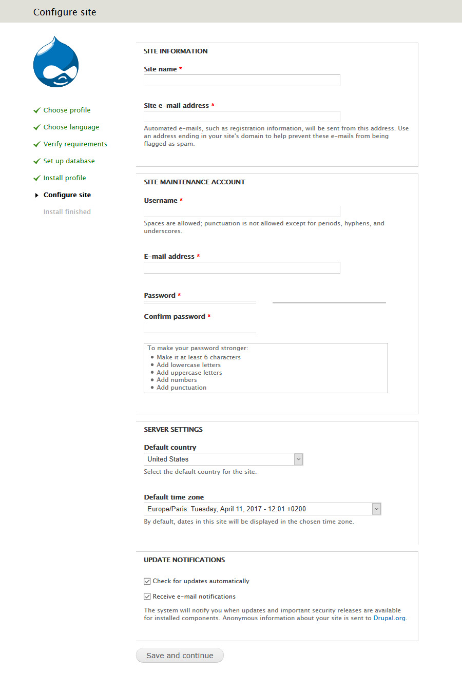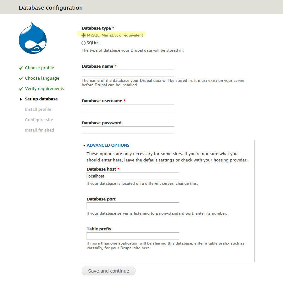 5. Setup your database info on the "Database configuration" page and then click "Save and Continue". If you haven't created it yet, do it via phpMyAdmin or any other MySQL configuration app. Once you continue, the installation process will begin.