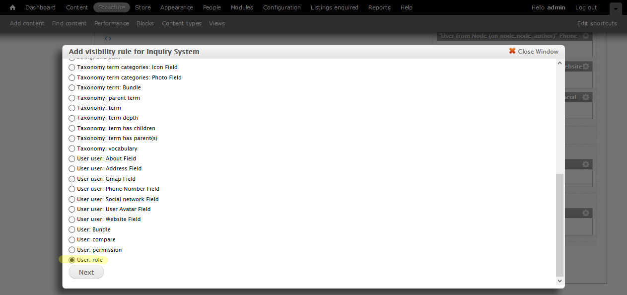 - In display page, configure settings for the User: role
