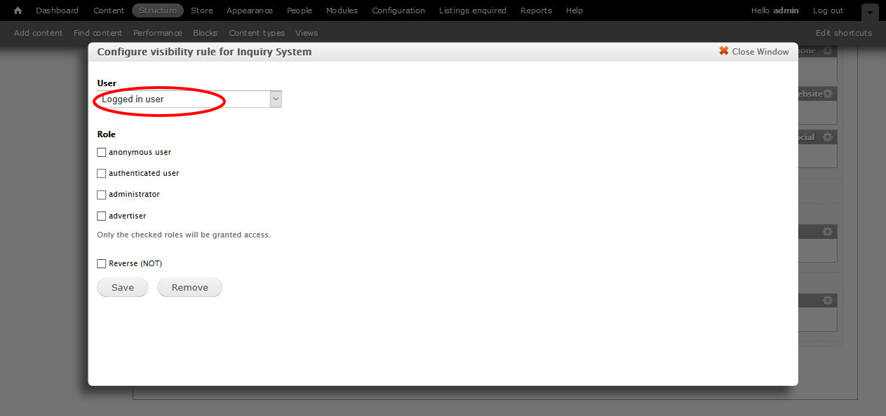 - Browse to http://example.com/admin/structure/block/manage/block/8/configure